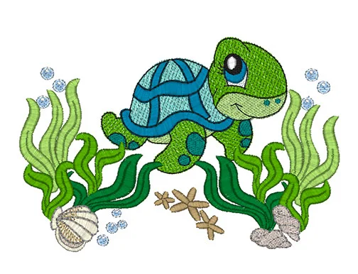 Mylar Sea Turtles is a playful collection of cute turtles that shine with Mylar Embroidery ®. Sea Turtles with water, bubbles, seaweed, shell and starfish accents, will make this machine embroidery collection a fast favorite.