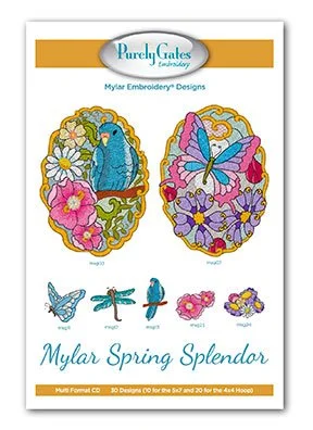 Mylar Spring Splendor is a colorful collection celebrating the arrival of Spring and sparkling with the fabulous shine of Mylar Embroidery ®. Birds, dragonflies, flowers, bees, butterflies and more make this machine embroidery collection a Spring Splendor.
